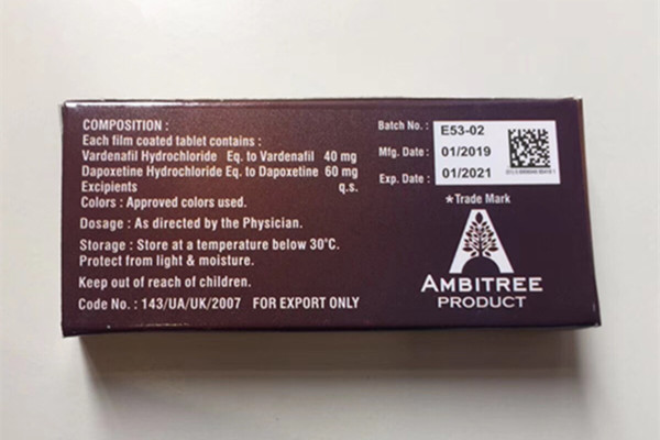 印度艾力达双效片,成分是伐地那非40毫克+达泊西汀60毫克,助勃和延时双效,用于增强阴茎勃起硬度和延长性活动时间,服用后15-20分钟即可在性刺激的作用下感觉到明显的的助勃效果,适合服用后需立即进行性活动的场合使用。